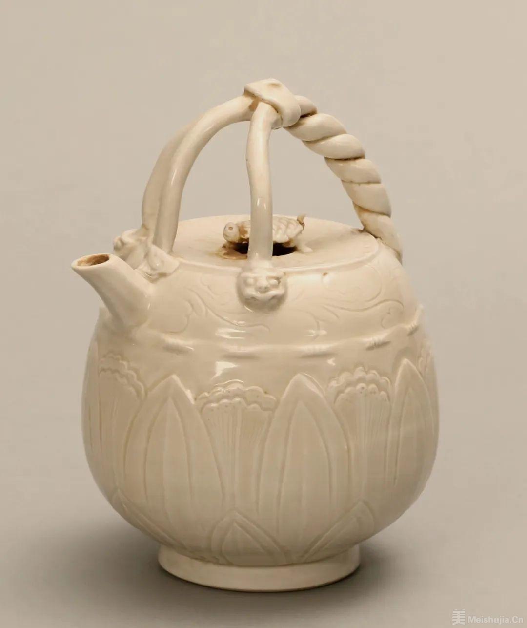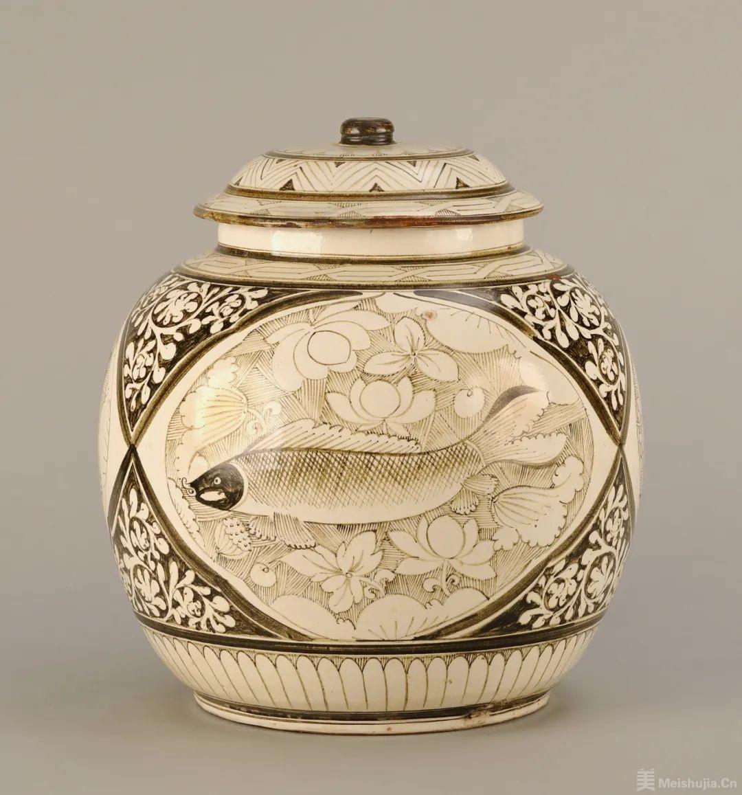 值得关注的展品包括宋定窑白釉刻花三叉提梁壶、金磁州窑白地黑花开光鱼纹盖罐、元青花祥龙瑞兽牡丹纹兽耳罐、明嘉靖青花云鹤纹大罐等。