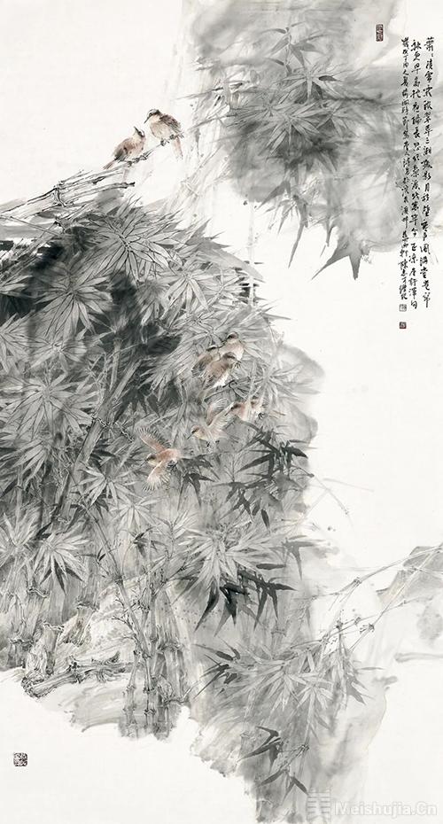 他的笔墨从元、明诸家入手,王冕、林良、陈淳、徐渭等,博采众长,且能自出机杼,兼具形似与生韵。他的构图,善于运用大密大疏的空间布局来展现深远意境,使观者产生无尽的遐想与共鸣。他的艺术风格既有水墨氤氲、淋漓恣肆的写意之境,又有活色生香、精勾细染的工笔之美;既有深厚沉稳的笔墨功力,又有匠心独运的构成形式;既有东方传统文化的诗意底蕴,又有西方现代艺术的创新精神。