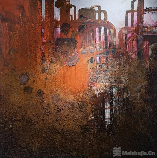 综合材料艺术是邹明近年来探索的一个新领域。与水墨艺术相比,综合材料创作更体现出邹明独特的视觉思维,以及对不同材料的匠心独运。《拓荒岁月》《火红岁月》《苍茫》等笔力雄强,而意象荒荒。在混沌恍惚的墨色中,在水与纸的交融中,抽象形态绽放出动人的光彩。另如《老屋遗韵》《残梦》《血色浪漫》,全以色彩的互动关系来营造画面,浓烈而深沉的暖色调似乎从遥远的梦中浸润而来,热烈而沉着,完美地诠释了画面的主题。邹明利用了材料的流动特性,让色与墨自由流淌,相互冲突、融合,纠缠在一起。色与墨不再是世间物象的叙事者,而是成为沟通天地的灵魂,在精神的广袤空间里作逍遥游,气魄如《庄子》所言“水击三千里,抟扶摇而上者九万里,去以六月息者也”。