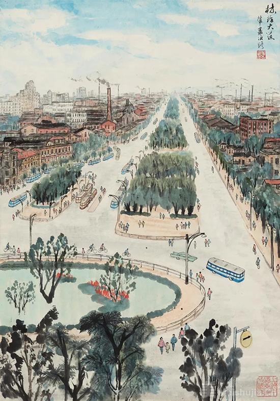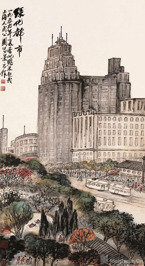 (5/6)《绿化都市》,朱屺瞻,纸本设色,1959年