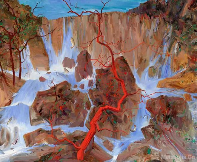 王朝刚与其作品在被阐释的过程中,逐渐形成若干组甚至带有矛盾张力的关键词辩证关系:第一,传统与当代的关系。“传统的当代转换”是中国当代艺术自上世纪八十年代以来的长期命题,却也因时代更迭而历久弥新。王朝刚绘画中所呈现的传统是叠合、生成、隐逸的混合体。例如《飞瀑》系列,既令人想起范宽《溪山行旅图》中的局部——水流奔袭、砸击地面,生猛有力;也具备石涛“山水清音”之悠然;更因层次交叠、反复覆盖的创作方式而带有些许黄宾虹“黑密厚重”之苍劲。另一方面,《飞瀑》多以瀑布为核心意象,亦容易引人联想至库尔贝那幅惊世骇俗的《世界的起源》。第二,宏观与微观的关系。《中国式风景》与《飞瀑》以山水为载体,抒发出艺术家的总体世界观与生命观;《知觉的森林》中既有宏大的自然景深,也藏匿细微的丛林叙事;至《盛景》,艺术家聚焦于生活周遭的花鸟虫鱼;而《秘境》则更进一步凝视枝叶微观,画面几近抽象。艺术家的视角犹如不断推进的镜头,实现了从全景到局部的多视野创作。第三,水与火的关系。若说水是王朝刚画作中的生命象征——他笔下的水流激昂澎湃,那么“火”则体现为艺术家在色彩选择上的倾向:红、黄、橙等暖色如火焰般燃烧于画布之上。这些闪烁生命欲望的焰光与水流交织,共同构筑出张扬、升腾、欢愉乃至狂欢的视觉景象。水体和红色皆为具有复杂文化意涵的象征物与象征色,它们的并置强化了画面中旺盛的生命动能。
