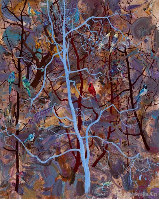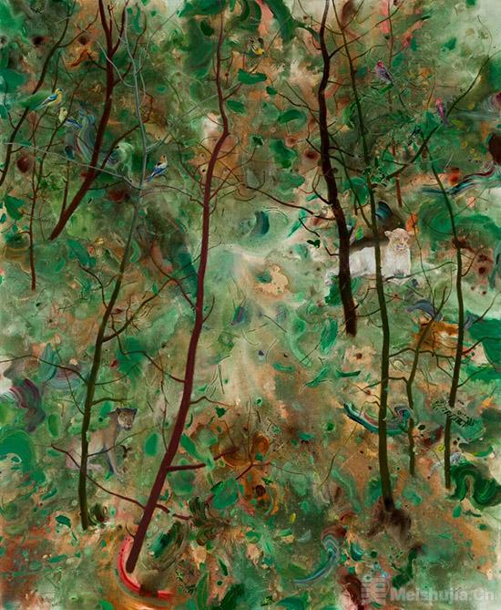 王朝刚的绘画为我们提供了对世界的不同观看与理解角度:既有对磅礴山水的远望,也有对丛林万物的近观,更有对花鸟虫鱼的近距离微观凝视。在表达不同的自然之境时,艺术家仿佛拥有“七十二变”的视野:他时而如翱翔于大地之上的雄鹰,以敏锐的视觉捕捉山水的瞬息,飞瀑奔涌向前,遒劲有力,焕发出澎湃的生命色彩;时而如穿梭于林梢与云深处的云雀,窥见幽秘林泉中蕴藏的丰盛信息;时而又如驻足花枝的夜莺,沉醉于绽放的生命气息与浓郁色彩之中。观看王朝刚的画作,犹如一场生命的奇遇——顺大河奔流,飞瀑直下,深入丛林,最终归于人间烟火。从天地宏大的生命力,到丛林世界的生机,再到生活空间中一束花的微光,艺术家在无形中引领观众完成了一次从宏观到微观的生命体验。