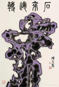 此次展出的赏石作品,是岳增光艺术探索的一次全新突破——他将青绿山水的创作技法与赏石题材完美融合,让笔墨的韵律与奇石的肌理相互交织,形成了独树一帜的艺术表达。在他的笔下,赏石不再是简单的自然物象复刻,而是承载着情感与寓意的艺术载体。其中,青绿色的赏石作品,延续了他青绿山水的经典色调,石身晕染的青黛与翠绿,似远山含黛、近水凝烟,将太湖石的清润之气与山水的空灵之境融为一体,观之令人心静神宁;红色的赏石则洋溢着热烈奔放的生命力,朱砂般的色彩浓艳而不失雅致,笔触遒劲有力,既凸显了奇石的嶙峋之态,又暗合“红运当头”的美好寓意,传递出积极向上的生活期许;紫色的赏石作品则更显典雅深邃,淡紫、深紫层层晕染,辅以留白与墨线勾勒,石形苍劲而不失灵动,恰应“紫气东来”的传统吉兆,蕴含着祥瑞安康的美好祝愿。