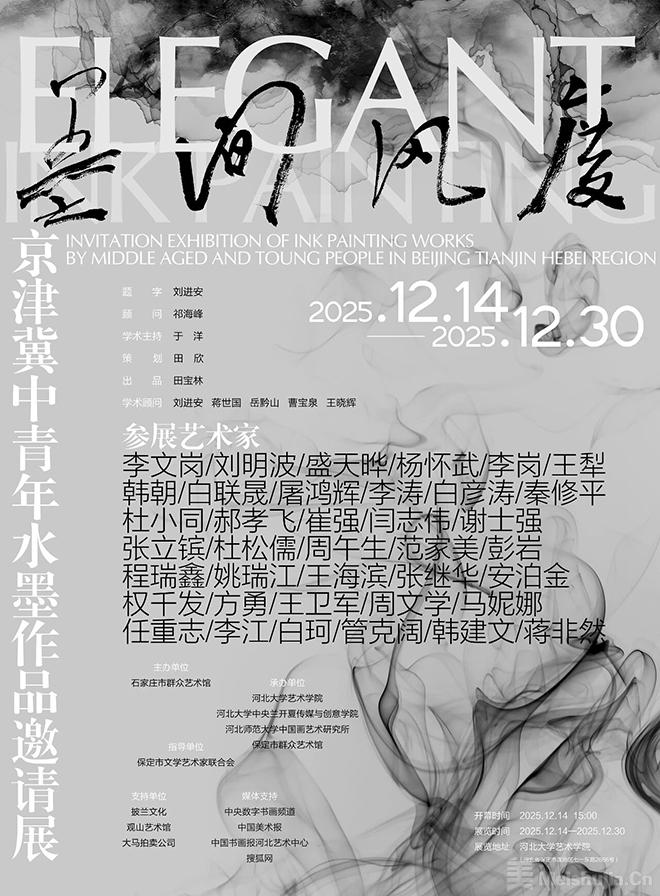 在2025年的岁末冬日,让我们走进京畿之门,相聚河北大学艺术学院美术馆,一同走进“墨间风度”的艺术世界,领略中青年水墨画家的艺术风采,感受当代水墨艺术蓬勃的生命力与创造力,共同开启一场跨越时空、对话心灵的艺术之旅。