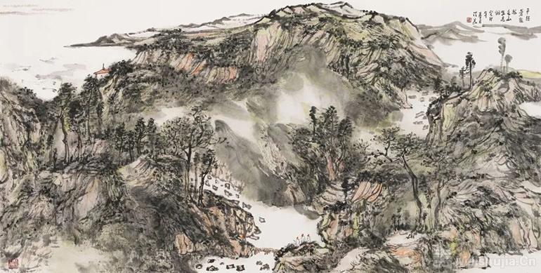 洪义兄的作品最打动人的是扎根生活的厚重。沂蒙山水的灵秀、军旅生涯的刚健,都化作他笔墨的底色。笔下山水如《近山生云烟》,墨色藏着浮来山晨雾的湿润,线条带着蒙山岩石的筋骨,刚柔相济间尽显文人情怀与军人赤诚。早年同写生时,他总说"山水有魂,得先懂它的筋骨",这份敬畏早已融入创作。