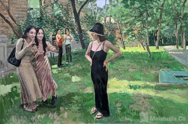 画有地域之风。东北油画在中国油画的格局中有着鲜明的地域特征,那就是表现性油画风格。作为东北表现性油画的代表画家,王建国早年即形成了表现性语言的追求:下笔恣意,充满感性;色彩强烈,诉诸直觉;肌理厚实,富有张力;光影斑驳,意态浑然。这些年,他在表现性语言的基础上进一步拓展,把“表现”和“写意”的结合作为研究课题。如果说“表现”是吸收西方现代绘画语言的话,“写意”则是朝向中国文化传统和东方感受方式的自觉,二者的结合在不少油画同仁那里已成为学术共识,体现出构建“写意油画”的路径。王建国在这方面的追求使他的作品呈现出悄然的新变,在取景布局上更加注重置身“现场”的整体感受,环视四方而取舍组合;在塑造形象时更加注重营造画面意境,下笔明确而气韵贯通。他善于一方面用刮刀厚涂重抹,任色彩在画面互补碰撞,一方面用中国毛笔勾画细节,使线条在空间穿插交织,两种笔法相辅相成,在视觉上形成强烈的张力。相比起前些年的作品,他的作品更具有一气呵成的内在韵律,把无意识的书写和刻画性的造型有机结合起来,形成“写意油画”的一家风格。