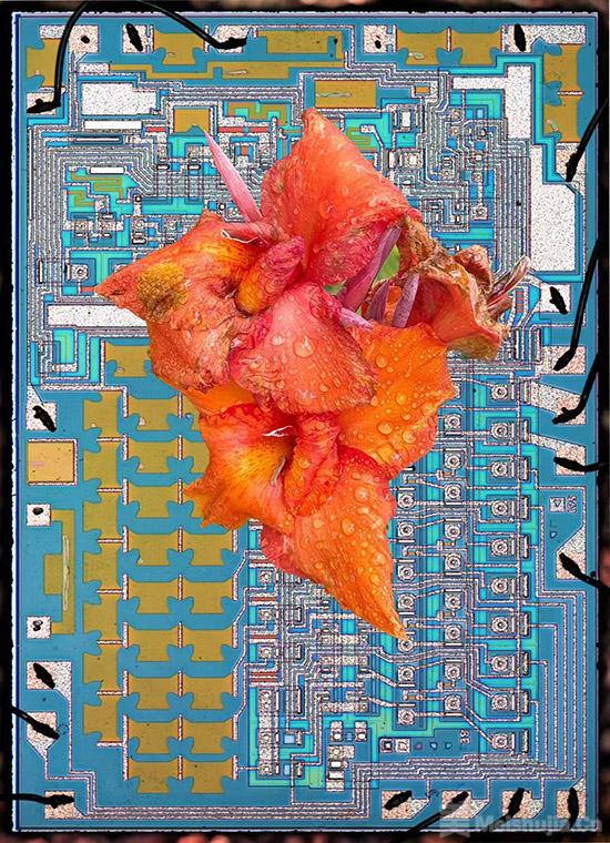 “尘灵”系列则是与一位阿根廷科学家共同完成的。这位科学家提供了一系列通过显微镜看到的电子芯片图像。于安随后将这些图像作为背景,在上面叠加了他在中国拍摄的花卉。这一系列艺术质量的数字印刷品,作为独一无二的