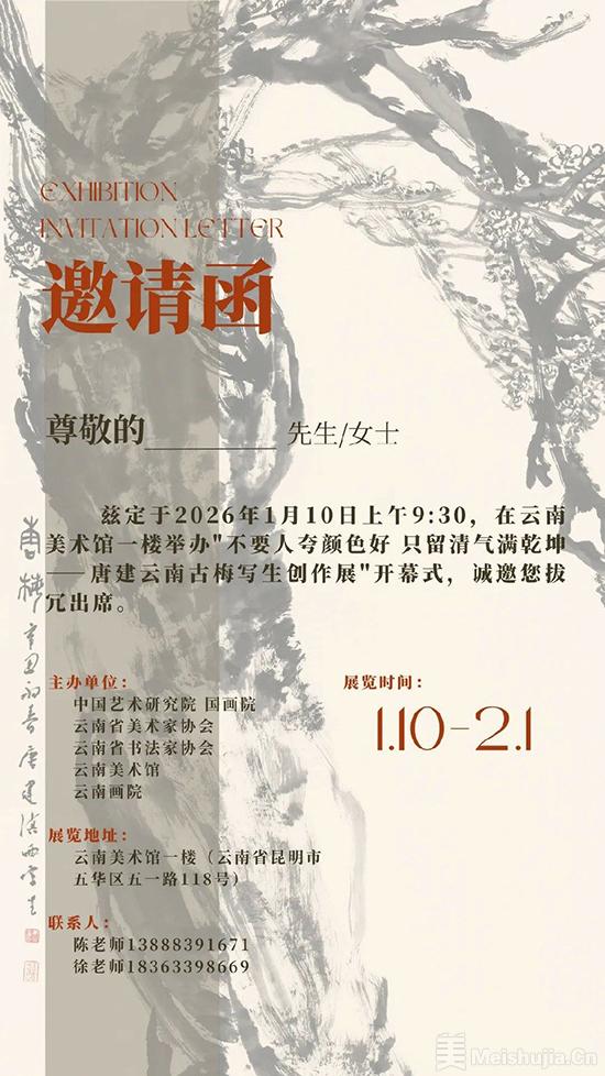 本次展览能完美呈现,离不开中共云南省省委宣传部、云南省文学艺术界联合会领导的关心和支持,亦离不开各主办、承办单位的通力协作。展览集中展出了唐建教授近年来创作的云南古梅题材书画作品及其他力作一百六十余件,辅以数百幅珍贵的摄影文献,立体地呈现了其艺术探索的轨迹与成果。作为一位长期深植于云南沃土的艺术家,唐建教授携新作回归云南,既是对其个人艺术生涯的一次系统梳理与集中汇报,更是对云南古梅文化滋养的深情回馈,体现了艺术家对这片土地的文化认同与精神回望。我们深信,本次展览对于深化云南书画艺术的研究与创作,推动区域文化发展具有积极意义,亦必将为广大群众与艺术爱好者奉献一场高品质的视觉文化盛宴。