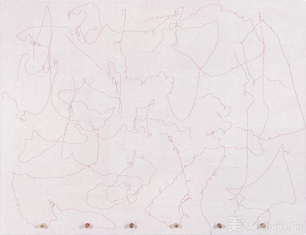展览将在两层展厅中呈现30余件绘画与装置作品。一楼聚焦于庄普从极简形式出发,持续探索物质性与空间关系的创作。例如《蛮荒原质》(1991)采用集合艺术(assemblage)手法,在画框围合的空间中纳入拾得物(found object)与微型绘画,构筑抽象画面与现实物件之间的能量场。展厅中年代最早的《遨游四方-黄》(1983)是庄普早期的重点作品,该系列援引庄子“遨游四方”的哲学思想,表达在秩序中游走、于限制中展开的自由精神。作品通过切割、折叠画布并将其封存于明黄色颜料中,借助重复与排列构建空间秩序,突出材料与结构的生成过程,可视为其后“印格”绘画的重要前奏。《红线》(2022)则延续了庄普自1990年代开始的“缝线”系列创作,在一厘米方格矩阵中,红线沿对角线无限延伸、往复,线头则随机散落缠绕。