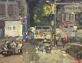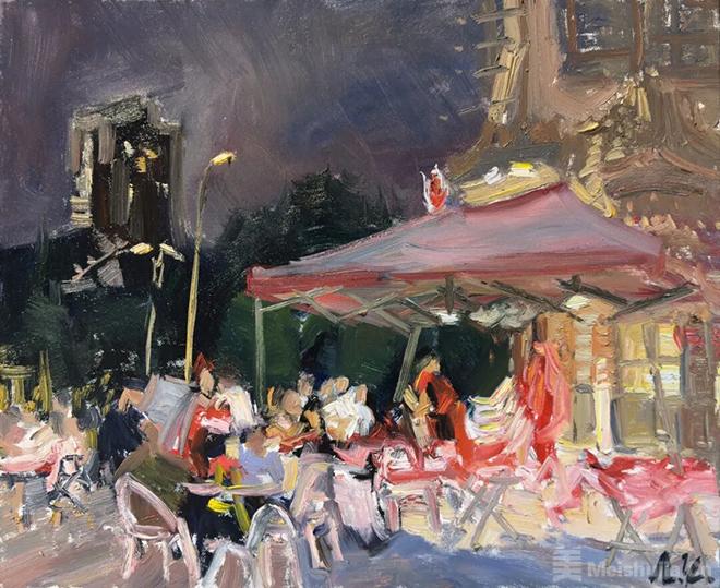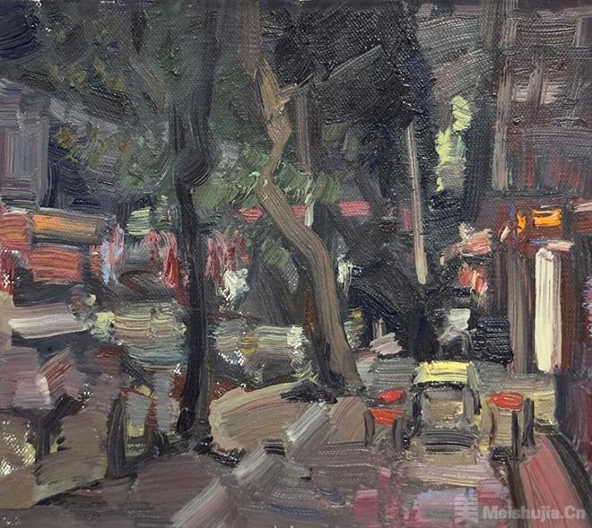 此次展出的风景作品,大多取材于廖正定工作与生活所在的南昌与景德镇两地。不论是街头的小吃摊,还是夜色中的高楼大厦,皆是他所熟悉的“附近”,即日常生活中所见的真实场景。他的油画写生作品可贵在关注和表现了日益发展中的城镇生活与变化。这种题材的选择,一方面源于他的童年记忆:幼年时他与爷爷奶奶在江西南昌湾里区度过童年,那片土地成为他心中风景记忆的底色。另一方面也与他所受到的现实主义创作方法有关——他选择以现场写生的方式,直面自己所处的城市、自然与人文景观,力图更直接、鲜活地表达出自身的感受与体验。更为重要的一点是,相较于其他题材,风景中所展现的空间与形态的丰富性,为他捕捉与组织点、线、面提供了充分的现场依据,并导向对画面抽象形式语言的探索。