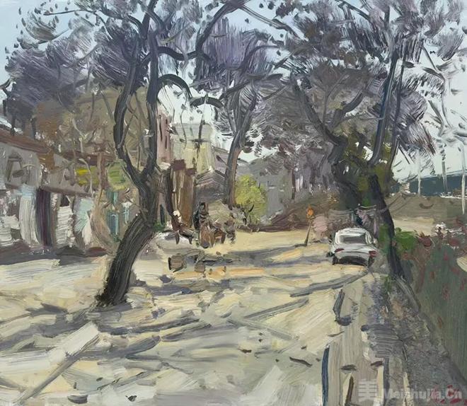 这种对画面中抽象形式语言的探索,源于廖正定在中国艺术传统、俄罗斯油画经典语言与现代艺术思想之间的思考。在中国艺术方面,他推崇吴冠中融合西方色彩与中国写意美学的路径。在俄罗斯画家中,他偏爱柯罗文,从这位游走于现实主义与印象主义之间的艺术家身上汲取形式与色彩上的启发。作为当代画家,他亦无法忽视二十世纪以来现代艺术所带来的观念更新与视觉冲击。因此,他对风景的描绘不仅限于写实再现,而是注重融入对平面构成与光影节奏的探索,在色调与笔触的平衡中,逐渐构建出一种介于二维与三维之间的画面结构,以此践行其个人油画语言的探索。