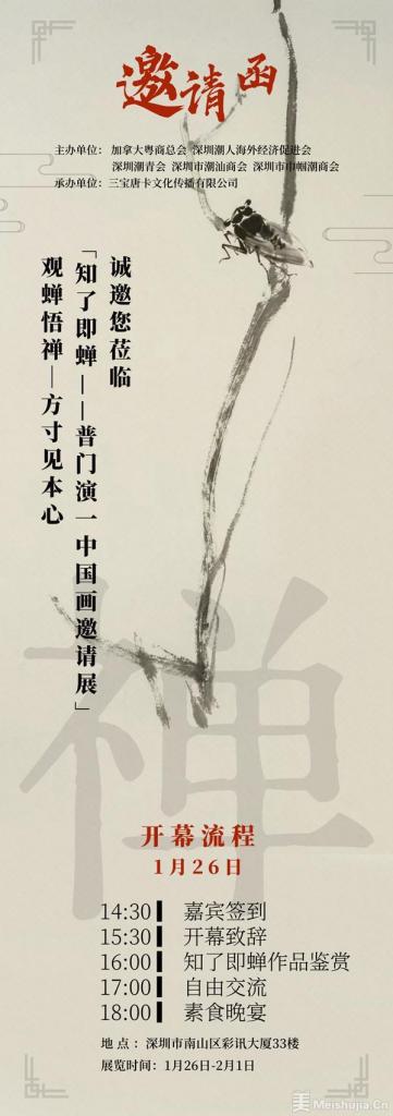 1月26日!由加拿大粤商总会、深圳潮人海外经济促进会、深圳潮青会、深圳市潮汕商会、深圳市巾帼潮商会共同主办,三宝唐卡文化传播有限公司承办的"知了即蝉"普演一中国画邀请展即将悠然启幕,欢迎大家于新年新月之际,暂别尘世喧闹,赴一场清净之约。在笔墨庄严与艺术慈悲中,照见本心,开启一年的心安之旅。