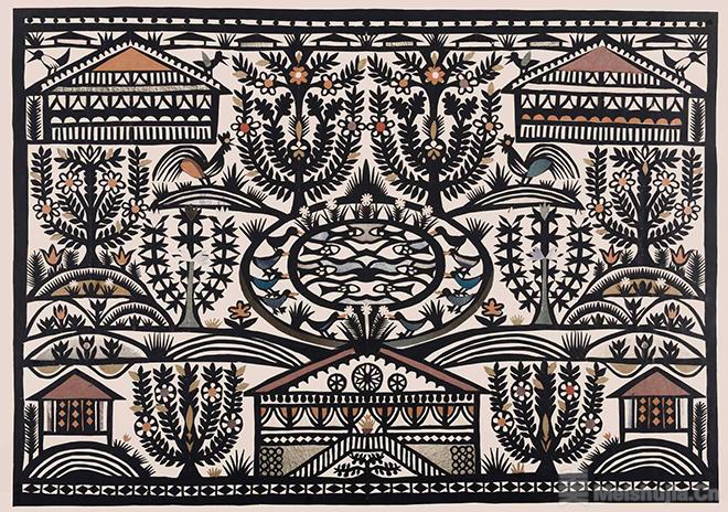 瑞士剪纸是一门叙事的艺术,以阿尔卑斯山区生活为创作核心,犹如凝缩的微观世界,通过其人物、形式和图案组合,引领观者沉浸其中。这类作品多以黑纸剪成,构图讲究对称,装饰繁复瑰丽,细节密布如织,呈现既鲜明又细腻的变化。