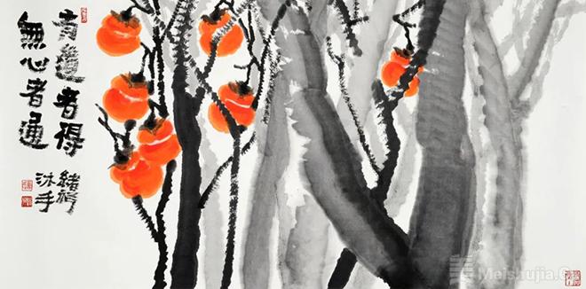 唐绪祥以笔墨为媒,但远超越于“唯手熟尔”的技法层面,而是通过山水、果蔬及文字闲章,建构精神家园,有梦里家山,也有烟火日常。所以,唐绪祥的画,画中无人,却处处透着旺盛“人气”:山是自家的山,楼是读书人的楼,桃是祝福寿诞的桃,柿是世俗人间的如意之“事”。其美在画面之内,意却在画面之外,他是以当代艺术家个体化的审美实践,诠释古人所追求的“澄怀观道”“卧以游之”的审美体验。