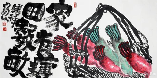 唐绪祥具有掌控水墨纸张等传统画材的高超能力,并将传统绘画中以诗书画印来经营位置的形式特质精准呈现。其画作的最妙之处在于墨与色的使用布置:山水重墨,在浓与淡中成就层次分明的山石树屋。尤其喜欢以重墨为山造型,呈现为浓黑的面;以淡墨勾出楼阁花树,呈现为清淡有序的线;又在水墨的洇渗中,融合出既有强烈对比而又柔和统一的黑白灰关系,真正做到墨分五色;偶以石绿染树、赭红着墙,由粉绿砖红点缀黑白灰的纯粹,因此更添缤纷趣味。蔬果重色,往往是墨线为廓,以斑斓重彩染就画中果蔬。其惯用粉绿、玫红和浓重的黄,在客观自然的基础上,恣意夸张。咧嘴的石榴、斑驳的苦瓜、茄子青椒、青红萝卜等,都处理得多彩炫目。画中图文互补,多以大字点题并填充空白,字形质朴方拙,金石意味浓厚,因此更具装饰意味。唐绪祥曾师从李可染、白雪石、张仃诸先生研习山水绘事,又深耕金工数载,这让他的绘画作品既有传统绘画的笔墨精神,又呈现出深厚的工艺美术功底,成为当代艺术家重新阐释传统艺术的一个典型案例。