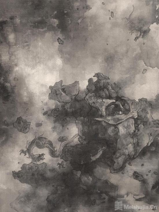 本次展览聚焦“天象”系列,锚定“人生彼岸”的精神意象,以中国礼器为文化原点,以当代水墨为表达语言,打破传统山水的叙事范式,将笔墨的意趣升维至星辰星云、穹宇深空的宏大场域。在泰祥洲的笔下,水墨不再局限于“咫尺山林,逸气满怀”的文人雅趣,而是成为连接天地、通达古今的精神媒介;山水也不再是具象的丘壑林泉,而是转化为承载宇宙秩序、人文信仰的精神符号——青铜礼器的“通天达地”之韵,化作水墨笔墨的层叠流转;上古文明的“敬天法地”之思,凝练成画面中虚实相生、明暗交错的宇宙景深。