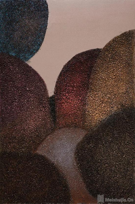 夏金旺的创作中隐隐流动着对“形”的不同理解,构成了此次展览的内在学理线索。有时,材质的颗粒感与色温自然契合于山岚、云雾的诗性想象,是材质本性与东方审美之间无声的相互指认;有时,薯莨渣滓以其不规则的椭圆形态在画面中自我还原,艺术家近乎退出,让物质保有被碾碎之前的最后形状;而在更多近作中,几何框架与有机肌理构成静默的对峙,形在场,却已开始隐去——“遁”不是消失,而是一种主动的精神收敛。这三种姿态并非截然分立,而是彼此渗透的内在线索,共同指向同一方向:创作主体的意志被持续悬置,物质的自我表达被持续打开。