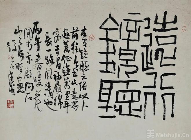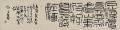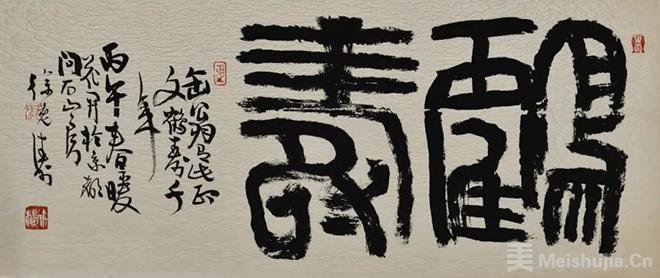 常言道:“士隔三日,当刮目相看。”徐涛君诚为此士也。近年他尤着力于大篆研习。焦黑浓重的墨线仿佛刻划进纸面,又像商周青铜器铭上那浮起的阳文线条,真是具有强烈的金属感和金石气。他以行草笔意参化金文大篆与汉篆殳书,雍容疏放,古奥奇曲,一如凸凹有致的印面文字,令人称奇。徐涛君之行草完成了从碑学向帖学的华丽转身。我曾见其临写的《唐人摹万岁通天帖》的王氏一门书,颇具东晋风度。而近期其行草,气息古雅内敛,潇洒从容,更获精进,毫无一点碑派书家在点线上的滞涩和造作。