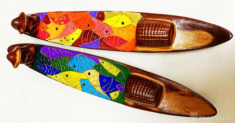 作者运用铜丝作为勾勒画面的 “画笔”,那纤细而坚韧的铜丝,沿着构思巧妙的线条蜿蜒游走,以一种极具秩序感又不失灵动的方式,架构起了整个作品的筋骨,赋予画面清晰的轮廓与层次,宛如为我们搭建起了一座通往那充满故事的海洋世界的桥梁。然而,真正让这幅作品活起来的当属那五彩斑斓的彩砂。它们在铜丝勾勒的框架内,尽情地绽放着自己的光彩,仿佛被赋予了生命一般。作者巧妙地选取色彩、精心调配,将彩砂铺陈于其间,使得一群可爱的鱼儿跃然眼前。这些鱼儿形态各异,栩栩如生,每一片鳞片都闪烁着细腻的光泽,似乎正随着海水的波动而轻轻摇曳;它们活蹦乱跳,灵动的身姿仿佛正穿梭于澄澈的海浪之间,嬉戏玩耍,为整个画面注入了无尽的生机与活力,让人们不禁感叹这掐丝珐琅工艺竟能雕琢出如此灵动逼真的海洋世界。