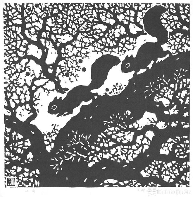 从画面呈现来看,《林间》描绘了两只活泼可爱的小松鼠在树林中相互追逐、嬉戏玩耍、欢快奔跑的场景。它们的身姿矫健、动作敏捷,仿佛带着一种扑面而来的生命力,那跃动的姿态与欢畅愉悦的心情跃然纸上。松鼠跳跃时所展现出的灵动之美,不仅让观者感受到了生命的活力,更能让人从中体会到深秋收获季节里那种独特的喜悦之情。在艺术表现手法上,画面整体呈现出古拙厚重的风格,力群先生以圆刀为主进行创作,刀法简洁明快,通过巧妙地运用黑白对比,营造出一种浑厚且富有节奏感的视觉效果。这种淳朴而又抒情的意境,使得作品具有一种独特的艺术感染力,让每一位观者都能不由自主地被其吸引,进而更为喜爱他的作品。