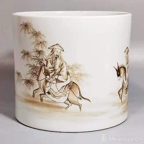 中国嘉德香港2024年春季拍卖会以1032.9万港元成交了一件清雍正墨彩杜甫游春图笔筒。这件笔筒直径16.4厘米,以极简的设计和精湛的工艺,展现了雍正时期的审美风格。笔筒的墨彩部分均由珐琅黑料绘制而成,以独特的绘画技法,将白与黑的水墨艺术完美呈现在瓷器上,赋予其一种类似纸绢水墨画的墨趣神韵。笔筒外壁上的杜甫游春图,画面清雅,空灵飘逸。两位高士头戴斗笠,骑驴行于水中,一人执鞭持缰,回头探望,另一位则仿佛有酒醉之态,小心跟随。身后一侍从,肩负雨伞,躬身挽裤腿,疑似探路。水间石矶突兀,沉稳又不失秀润,松树枝虬叶茂,间生草叶。全器主题纹饰以墨彩为之,脸部细节以淡刷红彩点染,惟妙惟肖。笔筒内壁光素,底部一圈无釉,可见胎体厚重坚硬,胎质细洁坚致。底心青花书“大清雍正年制”六字楷书款,是雍正时期官窑的上等精品。