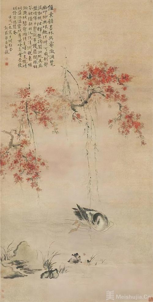 春风轻拂,冬日的沉寂在宋代诗人苏轼“竹外桃花三两枝,春江水暖鸭先知”的吟咏中,被温柔地唤醒。与鸭子有关的众多画作中,清代画家华嵒笔下的《桃潭浴鸭图》令人印象深刻。华嵒是扬州画派的代表人物之一,他擅长诗、书、画,被誉为“三绝”。他的《桃潭浴鸭图》现藏于北京故宫博物院,画幅长271.5厘米、宽137厘米,为华嵒61岁时的匠心之作。画面左上方,画家自题一首五言诗,并落款“壬戌小春写于渊雅堂,新罗华嵒并题”,同时钤有“布衣生”“华嵒”两方印章,另有“被明月兮佩宝璐”等四方印章相衬。图中,虬曲的桃树枝干上,粉红色桃花竞相绽放,犹如锦绣般绚烂。几枝初生嫩叶的柳条轻轻垂落在潭面上,触动着水面,泛起层层涟漪,引得潭中的野鸭频频回首。此图采用华嵒独具特色的小写意画法,桃花、柳条与岸边的小草虽用笔简练,但色彩和谐,布局张弛有度,野鸭的毛羽、姿态也描绘得细腻入微,充分展现了画家捕捉自然情趣的敏锐洞察力。