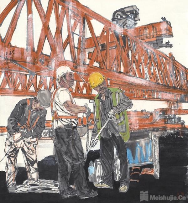 深入基层的艺术家,将太行山的雄浑气魄与建设者的热血豪情熔铸笔端。书法家吴行挥毫而就《“驰骋纵横”联》《“海为天是”联》,其墨色苍劲处若斧劈刀斫,飞白处似云雾蒸腾,将文字表述与艺术形式完美统一。国画家郭建明的《架上春秋》,用写实手法描绘架桥工人的劳动瞬间,形象鲜明生动,宛如劳动现场五线谱上跃动的音符。