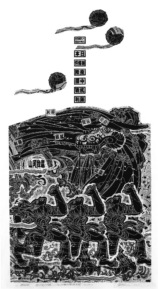 戴政生 雄狮之醒—记中国抗战胜利日 120×230cm 黑白木刻 2015年