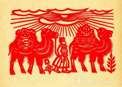 版画家力群与晋西北农村妇女牛桂英合作而成的《八路军骑马》,用剪纸手法表现了骑马的八路军形象,力群创作了轮廓,里面的形象则由牛桂英剪成。画面刻画生动简洁,八路军战士躬身驾马,肩背步枪,身挎背包,背带草帽,看形象应该是穿插于前线与后方的通信兵,这是在抗战时期常见的八路军战士形象。作者根据对生活的敏锐观察,准确地抓住了八路军骑马形态与动作,画面之中利用剪纸线条飘动的走向,呈现出人物疾驰的动感。这幅由版画家和农民合作的作品充分体现了延安美术家向群众学习的虚心态度。