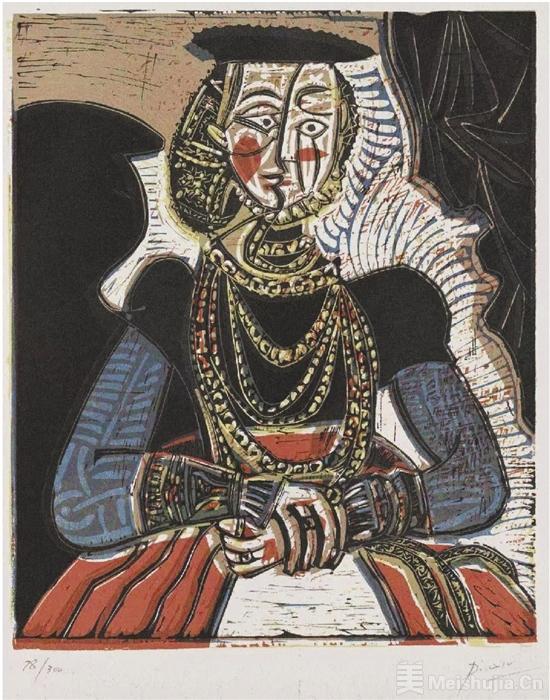 巴勃罗·毕加索 依据卢卡斯·克拉纳赫作品创作的女子肖像 27×22cm 麻胶版 1962年