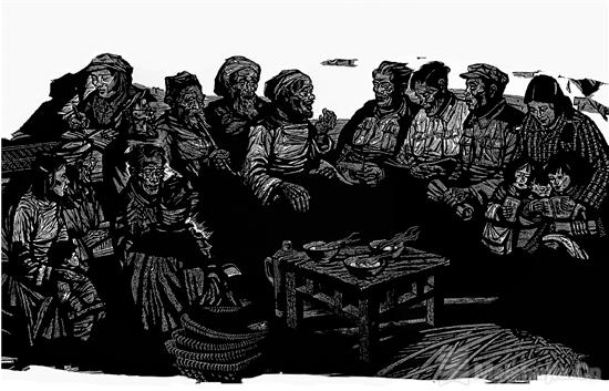 戴政生、黄静 大兴调查研究之风(局部) 黑白木刻 2021年