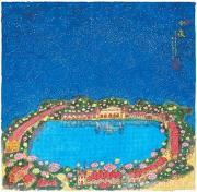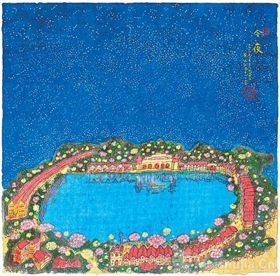如果说《小夜曲》是黄永玉“我与你”的告白,那么《今夜》便是“我与世界”的宣言。画面中,湖畔宁静,繁星满天,万家灯火与绚烂烟花交相辉映,营造出一种平和而温暖的氛围。他在题跋中写道:“愿上天给人间每个人都有美好的今夜,天天如此,月月如此,年年如此,十年如此,百年如此。告诉子孙们,人应该拥有如今夜之权利,过宁馨如今夜之日子。”