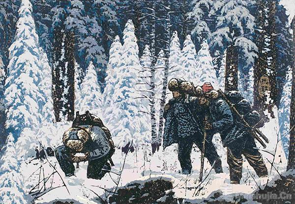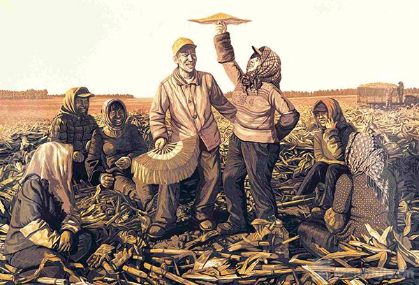 展览的第二部分反映了社会主义建设初期我国各民族人民的生产生活图景、精神风貌。晁楣是北大荒版画的主要开拓者之一。1958年,27岁的晁楣转业,参加北大荒垦区的开发建设。此次展出的《北方九月》是他的代表作之一。这幅作品构图开阔深远,层层叠叠的红高粱,充满火红的醉人诗情。被夸张了的高粱的形与色,也是作者亲自参加北大荒劳动的情感的表现。张作良的《通向密林深处》则展现了白桦林中,社会主义建设的如火如荼,画面大气磅礴、恢弘豪放,给人以美的享受。此外,张祯麒的《黑土早春》、郝伯义的《初踏疆原》、陈龙的《梦回赫乡》等,则反映了不同季节,东北大地自然景观和社会生产的蓬勃景象。