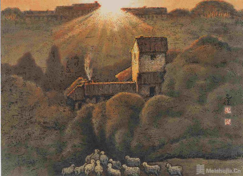 彩绘是杨先让艺术创作的另一个重要领域,他在中国传统水墨画的基础上,将油画的写实技巧、套色版画的形式语言以及民间壁画的斑驳肌理融为一体,创造出独具特色的彩绘样式。他的彩绘在题材上以风景为主,那些司空见惯的钟楼古墙、城镇街道、胡同小巷、层层深院,以及民宅建筑之中木格门窗、石阶瓦顶、石榴凤仙,还有阳光明媚的北方乡镇、细雨朦胧的南方水乡,无不是画家笔下素材的来源。杨先让的彩绘作品充满了对于中华大地故土家园的热爱,尤其是他在美国寓居期间创作大批彩绘作品,以此传达对祖国真挚而深沉的情感。