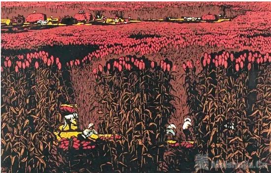 在展出的众多作品中,北大荒版画的主要开拓者之一、著名版画家晁楣的一幅《北方九月》尤其突出。晁楣在长期的艺术实践中,形成了刀法豪放、构图宏伟、意境深邃、色彩浓郁的独特艺术风格。如果说晁楣的作品构成了北大荒拓荒史诗的壮丽乐章,这件《北方九月》则是其中最为华美绚烂的一节。这幅作品构图开阔深远,层层叠叠的红高粱,充满火红的醉人诗情。经过开垦的北大荒金秋世界景色壮观,被夸张了的高粱的形与色,也是作者亲自参加北大荒劳动的情感表现。宏伟的构图,浓重的色彩,豪放的刀法,美得令人陶醉的意境,使这幅作品成为一首对自然、对劳动的赞美诗,同时也体现了画家对这块曾经洒下许多汗水的土地的无比深情。在这幅作品中,写景是为了抒情,景与情得到了有机的统一;丰收与劳动紧密相连,劳动创造美好世界的主题得到了突出的表现。