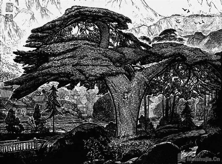 朱曙征 《凤凰松》 水印木刻 43.5cm×59.5cm 1979年